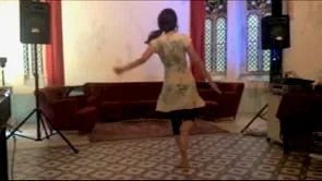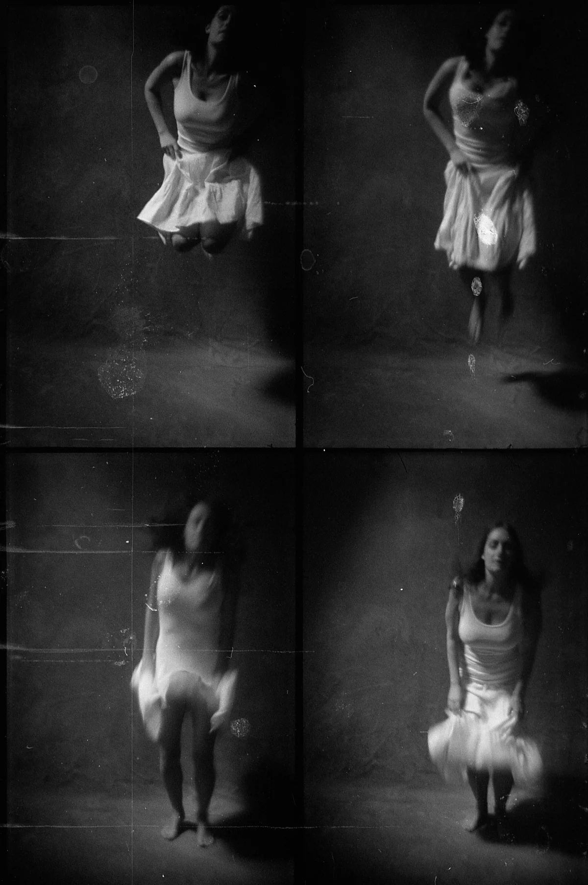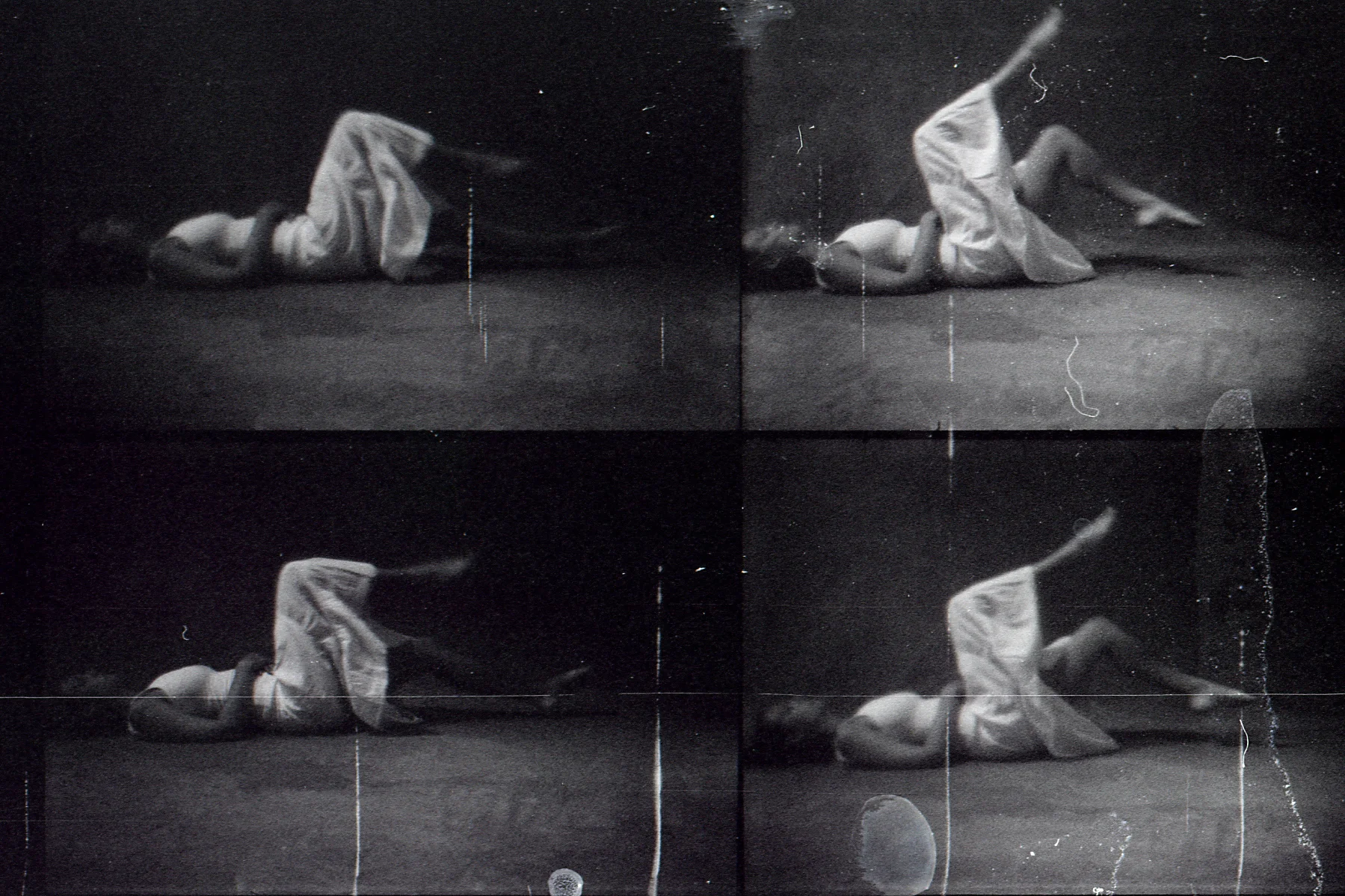 2. Tanz: Der Körper ist in einem Netzwerk aus Wollfäden, ein symbolischer Raum, der allerdings visuell ebenso zum Raum wird. Der Tanz funktioniert in Interaktion mit der improvisierten Musik und den materiellen Grenzen des Gewebes.